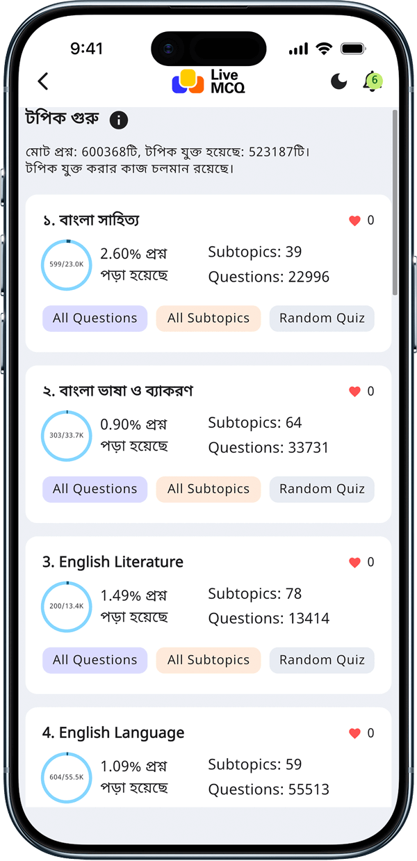 এই ফিচারে আপনি Live MCQ™ অ্যাপের সকল প্রশ্ন পেয়ে যাবেন একসাথে।