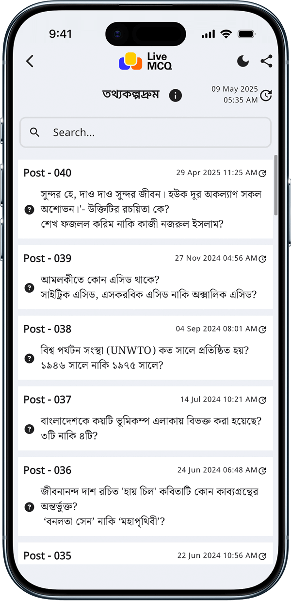 এই ফিচারের মাধ্যমে Live MCQ™-এর আর্কাইভ থেকে যেকোনো প্রশ্ন খুঁজে বের করুন সহজেই।