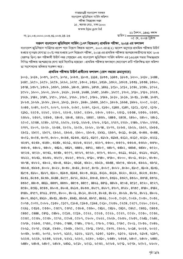 ১৭তম বিজেএস প্রিলিমিনারি পরীক্ষা অনুষ্ঠিত হওয়ার ঠিক একদিনের মধ্যেই প্রিলিমিনারি পরীক্ষার ফলাফল প্রকাশ করলো বাংলাদেশ জুডিশিয়াল সার্ভিস কমিশন। আজ ৫ মে ২০২৪ তারিখে একটি বিজ্ঞপ্তির মাধ্যমে ১৭তম বিজেএস পরীক্ষার ফলাফল প্রকাশ করলো সংস্থাটি। যেখানে বলা হয়েছে বাংলাদেশ জুডিশিয়াল সার্ভিসের প্রবেশ পদ সহকারী জজ পদে নিয়োগ বিষয়ক আদেশ ২০০৭ এর ৪(২) আদেশ অনুসারে প্রিলিমিনারি পরীক্ষায় উত্তীর্ণ হওয়ার নূন্যতম যোগ্যতা ৫০% নম্বর হওয়ায় ১৭তম বিজেএস পরীক্ষায় অংশগ্রহণকারীদের মধ্য থেকে ৬০৩ জন পরীক্ষার্থীকে প্রিলিমিনারি পরীক্ষায় উত্তীর্ণ করা হয়েছে।