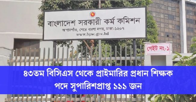 ৪৩তম বিসিএস থেকে প্রাইমারির প্রধান শিক্ষক পদে সুপারিশপ্রাপ্ত ১১১ জন