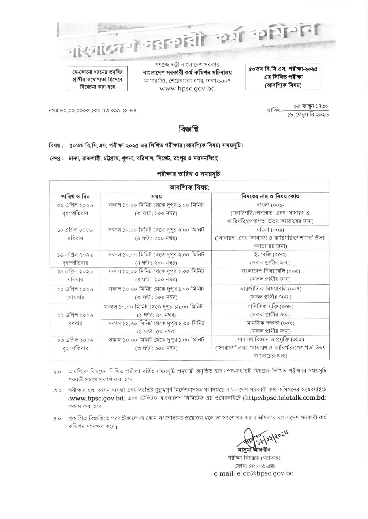 ৫০তম বিসিএস লিখিত পরীক্ষার সময়সূচি