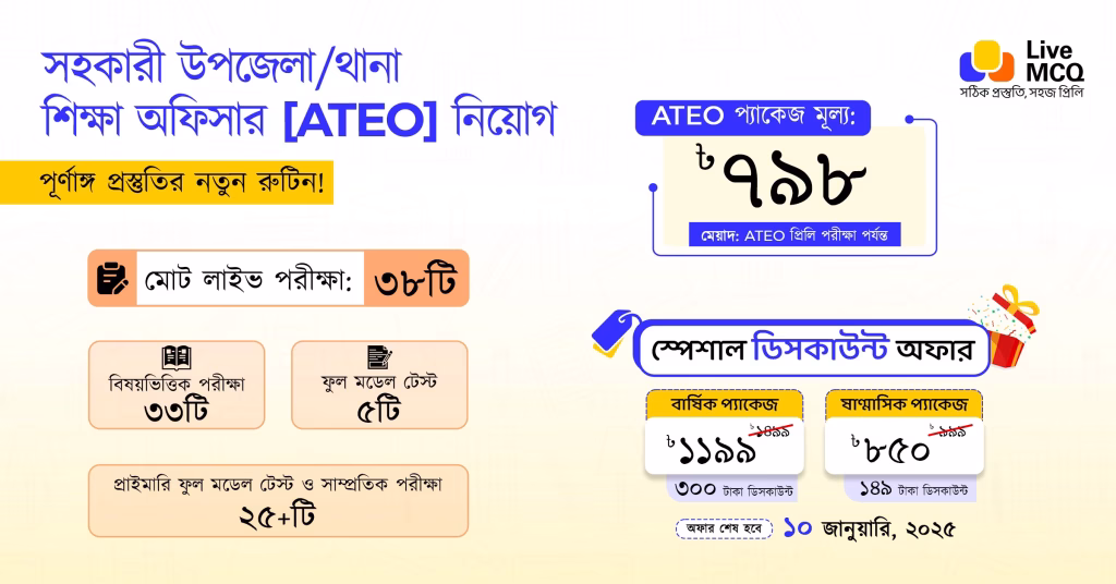 প্রিয় ব্যবহারকারীগণ, সবাইকে Live MCQ টিমের পক্ষ থেকে শুভেচ্ছা। আশা করি সকলেই সুস্থ আছেন এবং পড়াশুনার সাথে আছেন। আমরা সকলেই জানি যে, প্রাথমিকের শিক্ষকদের মধ্য থেকে ATEO নিয়োগের একটি বড় নিয়োগ বিজ্ঞপ্তি দেওয়া হয়েছে। পরীক্ষার তারিখ না দিলেও আশা করা যায় আগামী বছরের যেকোন সময় পরীক্ষা অনুষ্ঠিত হবে।