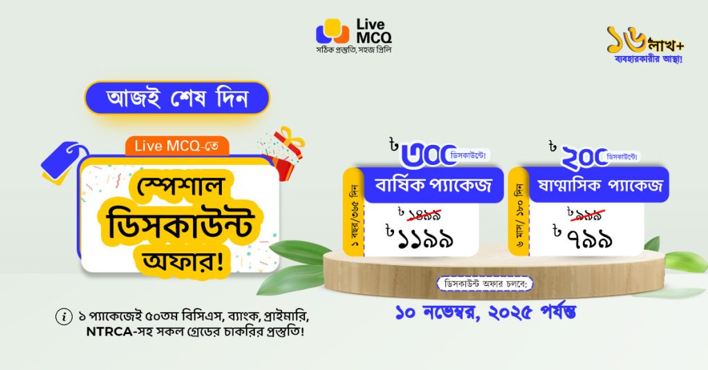 Offers Live MCQ বার্ষিক ও ষাণ্মাসিক প্রিমিয়াম প্যাকেজে চলছে স্পেশাল ডিসকাউন্ট অফার 🥳 Live MCQ প্রিমিয়াম প্যাকেজে বছরের শেষ স্পেশাল ডিসকাউন্ট অফার! 🔥 💥 Live MCQ প্রিমিয়াম প্যাকেজে চলছে এই বছরের সর্বশেষ Live MCQ November 10, 2025