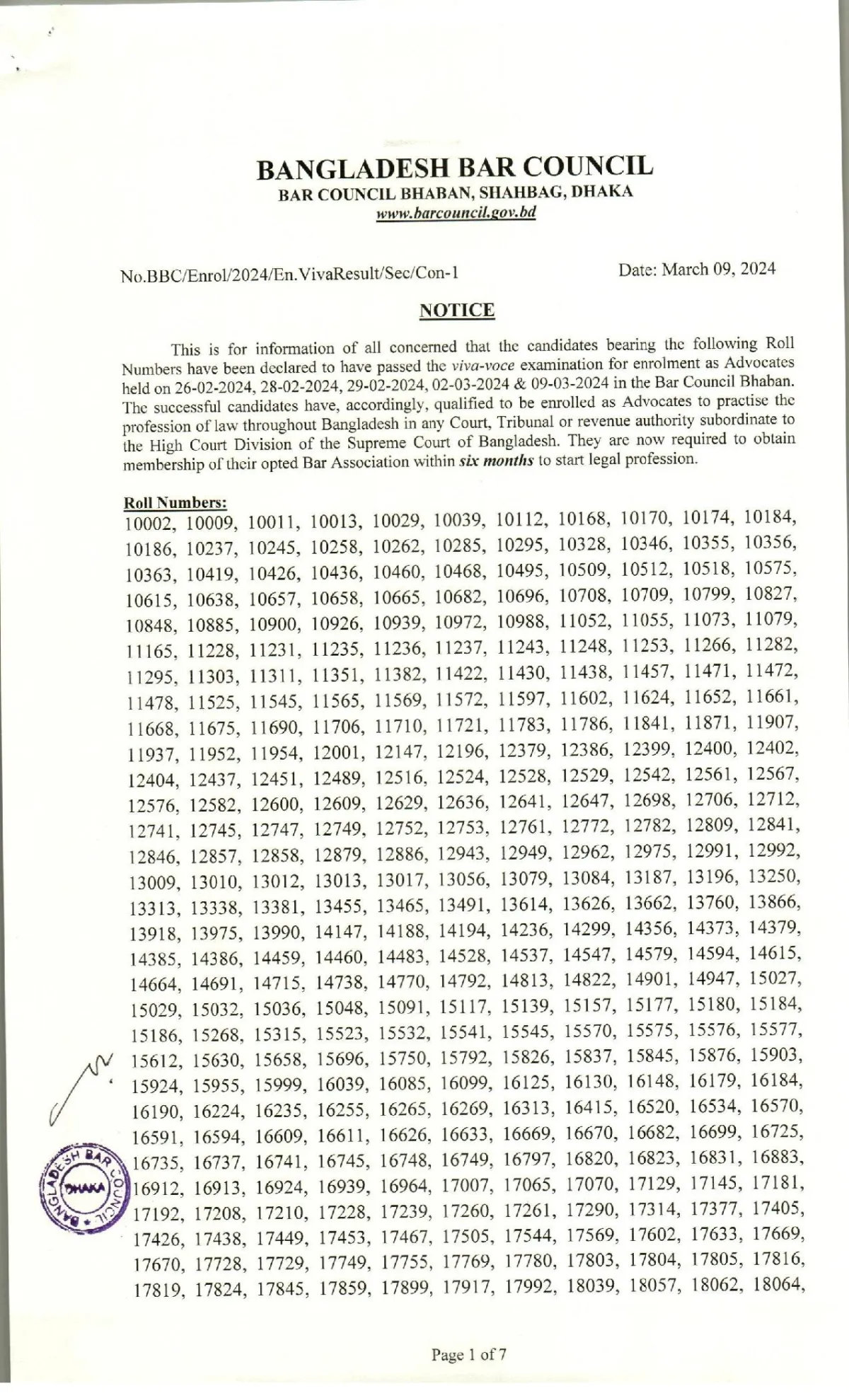 ৯ মার্চ ২০২৪ তারিখে প্রকাশিত বাংলাদেশ বার কাউন্সিল পরীক্ষার রেজাল্ট এবং উত্তীর্ণ প্রার্থীদের রোল নম্বরের তালিকা নিম্নে প্রকাশ করা হলঃ