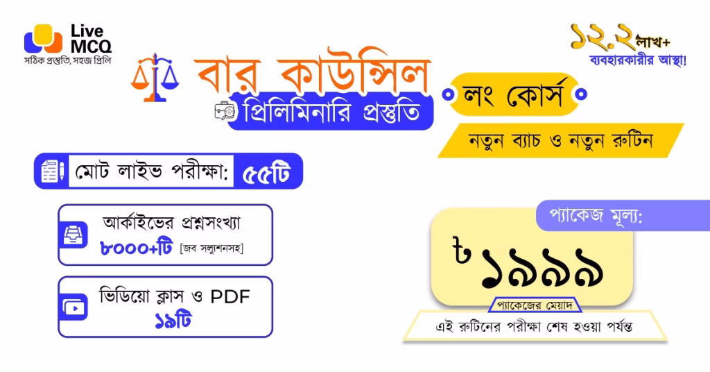 বার কাউন্সিল অ্যাডভোকেটশীপ পরীক্ষার প্রশ্ন প্যাটার্নে সাম্প্রতিক সময়ে বেশ পরিবর্তন এসেছে, গতানুগতিক প্রশ্নের পরিবর্তে বিজেএস প্যাটার্নের সমস্যামূলক প্রশ্ন আসার প্রবণতা দেখা যাচ্ছে। পরীক্ষায় সফল হতে তাই সিলেবাস ভিত্তিক পূর্ণাঙ্গ প্রস্তুতির কোন বিকল্প নেই। আপনাদের প্রস্তুতিকে সুসংহত করতে Live MCQ ‘বার কাউন্সিল এনরোলমেন্ট পরীক্ষা’র পূর্ণাঙ্গ প্রস্তুতির জন্য লং কোর্সের আয়োজন করছে নতুন আঙ্গিকে।