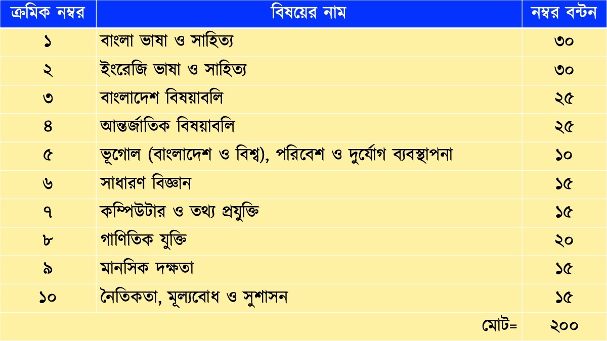 ৩। বাংলাদেশ বিষয়াবলি (প্রথম ও দ্বিতীয় পত্র)- মোট ২টি বিষয়ের জন্য ২০০ নম্বর।