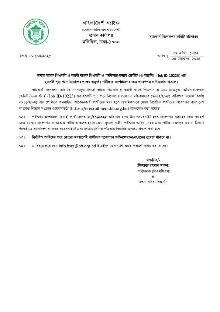 আগামী ১৬ অক্টোবর, ২০২৫ তারিখের মধ্যে প্রার্থীগণ নির্ধারিত ওয়েবসাইট থেকে প্রবেশপত্র সংগ্রহ করতে পারবেন। এছাড়া পরীক্ষার সময়সূচিসহ অন্যান্য নির্দেশনা পরবর্তীতে বাংলাদেশ ব্যাংকের নির্দিষ্ট ওয়েবসাইটের মাধ্যমে প্রকাশ করা হবে। উল্লেখ্য যে, উক্ত নিয়োগ বিজ্ঞপ্তিটি গত ১৯ ফেব্রুয়ারি, ২০২৫ তারিখে প্রকাশ করা হয়েছিলো।