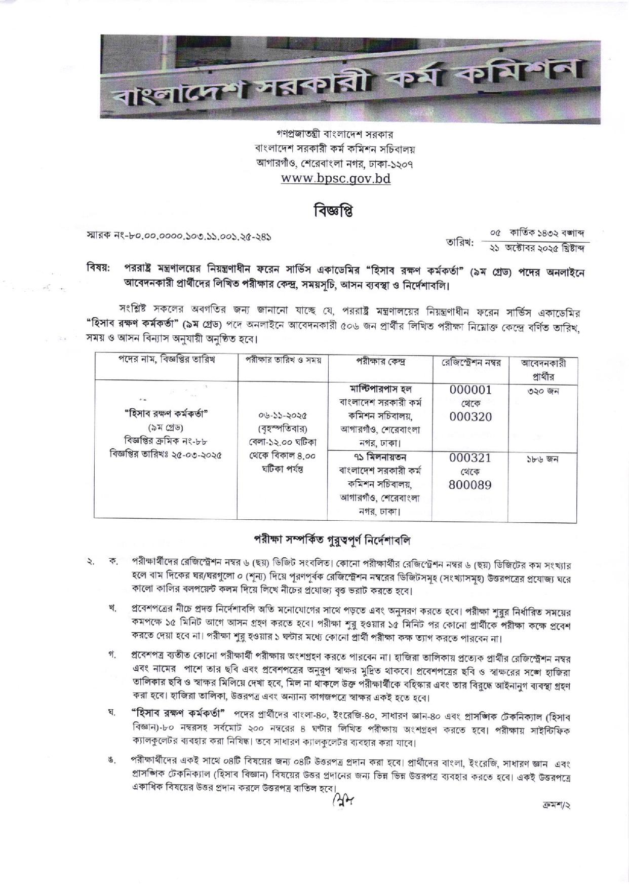 ফরেন সার্ভিস একাডেমি হিসাব রক্ষণ কর্মকর্তা পদের লিখিত পরীক্ষার সময়সূচি