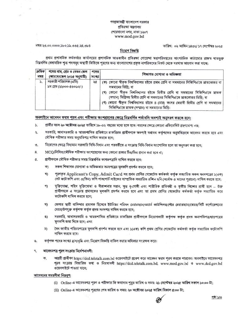 আগ্রহী যোগ্য প্রার্থীগণ ২১ সেপ্টেম্বর সকাল ১০টা থেকে ২০ অক্টোবর বিকাল ৫টা পর্যন্ত অনলাইনে আবেদন করতে পারবেন। আবেদনের সর্বচ্চো বয়সসীমা ৩২ বছর। ১৭ অক্টোবর, ২০২৫ তারিখ প্রতিরক্ষা মন্ত্রণালয় কর্তৃক প্রকাশিত এক বিজ্ঞপ্তির মাধ্যমে এ তথ্য নিশ্চিত করা হয়েছে।