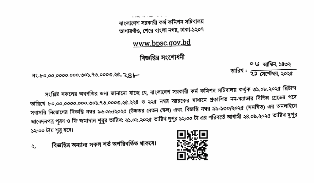 নন ক্যাডার এর বিভিন্ন পদে নিয়োগ পরীক্ষায় আবেদনের তারিখ পরিবর্তন