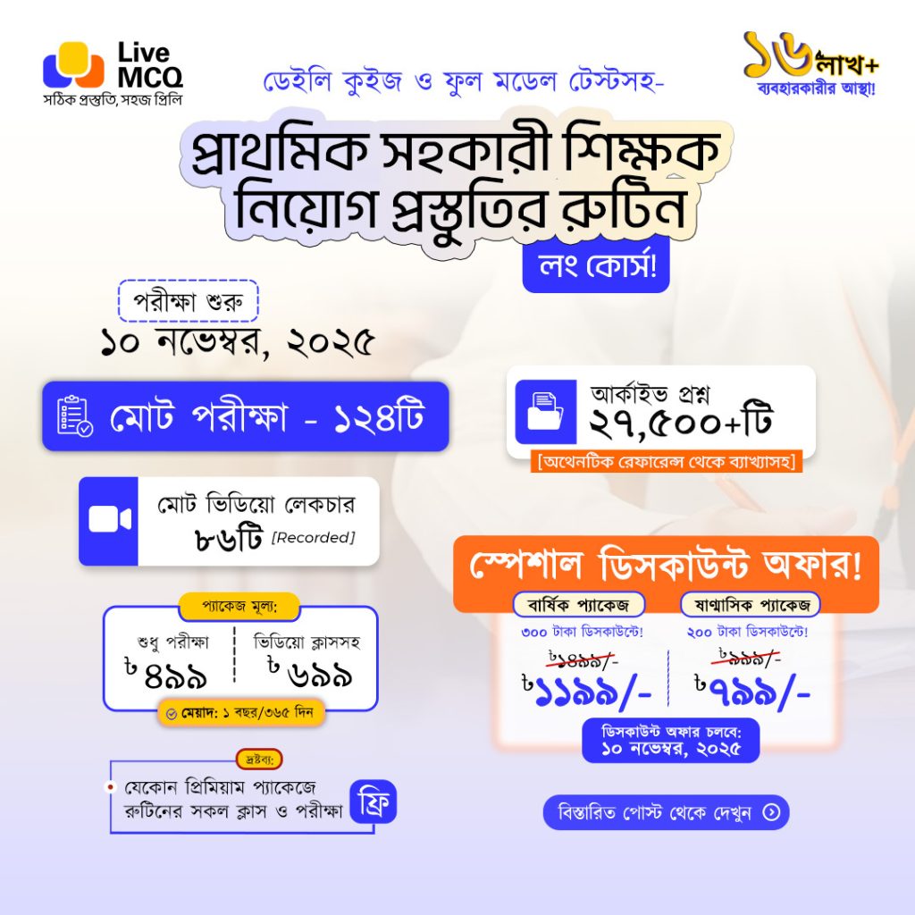 এছাড়া Live MCQ অ্যাপের শিক্ষক নিয়োগ ও নিবন্ধন বাটনে “প্রাইমারি প্রধান শিক্ষক ও সহকারী শিক্ষক নিয়োগ ২০২৫— পূর্ণাঙ্গ প্রস্তুতির নতুন রুটিন” চলছে।