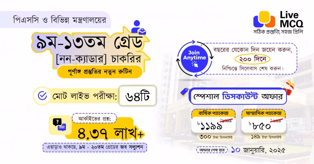 প্রিয় ব্যবহারকারীগণ, সবাইকে Live MCQ টিমের পক্ষ থেকে শুভেচ্ছা। আশা করি সকলেই ভালো আছেন, সুস্থ আছেন, নিরাপদে আছেন এবং সেই সাথে পড়াশোনার সাথে আছেন। পিএসসি সম্প্রতি নন-ক্যাডার [৯ম-১৩তম গ্রেড] পদের বিজ্ঞপ্তি প্রকাশ করেছে। আবেদন শুরু হবে ১৫ ডিসেম্বর, ২০২৪ থেকে। আমরা সকলেই জানি, PSC বিসিএস ছাড়াও ৯ম – ২০তম গ্রেডের চাকরির নিয়োগ পরীক্ষার আয়োজন করে থাকে। এছাড়াও বিভিন্ন মন্ত্রণালয়, বিভাগ, অধিদপ্তর, পরিদপ্তর, সরকারি বিভিন্ন স্বায়ত্বশাসিত প্রতিষ্ঠান সরাসরি নিয়োগ পরীক্ষার আয়োজন করে থাকে এবং প্রতি বছর এসব চাকরিতে প্রচুর জনবল নিয়োগ পেয়ে থাকে।