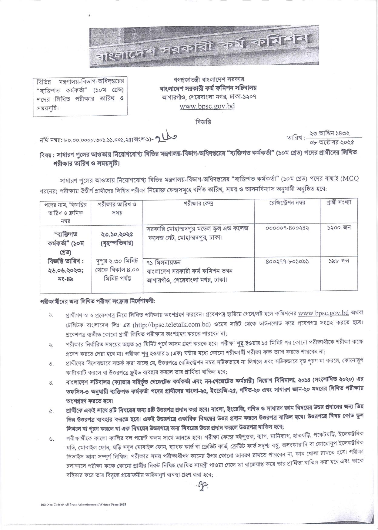 প্রিয় চাকরিপ্রত্যাশীগণ, আপনাদের অবগতির জন্য জানানো যাচ্ছে যে, বিভিন্ন মন্ত্রণালয়ের ব্যক্তিগত কর্মকর্তা পদের লিখিত পরীক্ষার সময়সূচি প্রকাশিত হয়েছে। বিজ্ঞপ্তি অনুসারে, সাধারণ পুলের আওতায় নিয়োগযোগ্য বিভিন্ন মন্ত্রণালয়-বিভাগ-অধিদপ্তরের “ব্যাক্তিগত কর্মকর্তা” (১০ম গ্রেড) পদের প্রার্থীদের লিখিত পরীক্ষা আগামী ২৩ অক্টোবর, ২০২৫ (বৃহস্পতিবার) দুপুর ২:৩০ মিনিট থেকে বিকাল ৪:০০ টা পর্যন্ত দেড় ঘন্টা ব্যাপী অনুষ্ঠিত হবে। আবেদনের ভিত্তিতে উক্ত পরীক্ষায় ১৩৯৮ জন প্রার্থী অংশগ্রহনের কথা রয়েছে।
